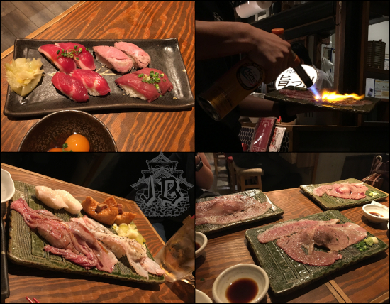 Since obviously we could not afford to have dinner there, we went for nikuzushi [肉寿司], which is basically sushi with meat, raw or cooked, instead of fish to a place called, of all things, Nikuzushi, in Ebisu [恵比寿] (albeit this is apparently a chain, so there are several of them around the city). This was unexpectedly yummy.